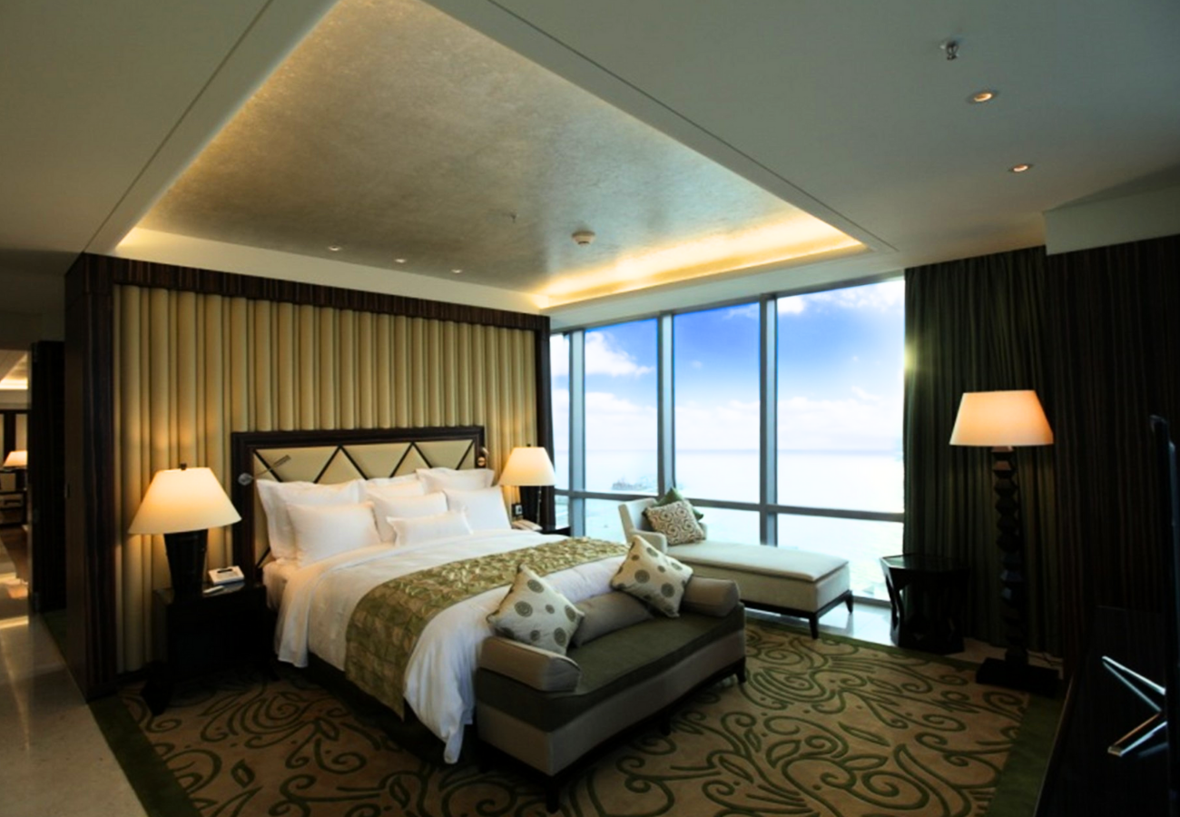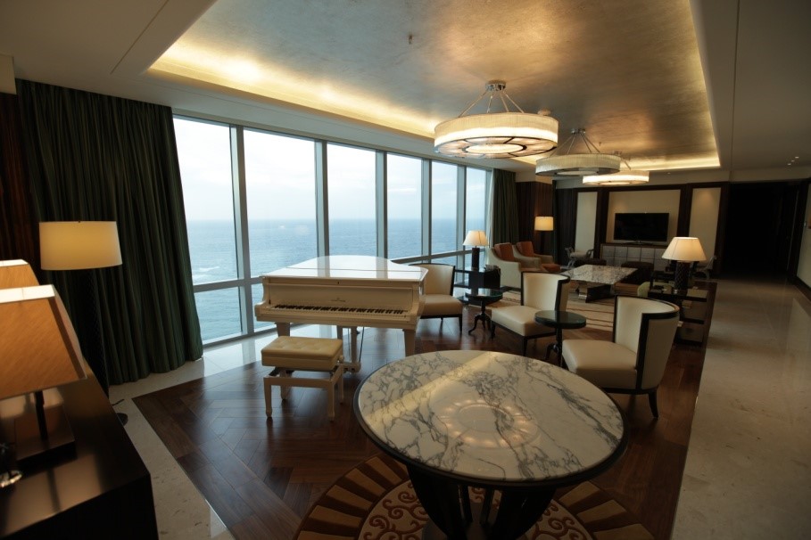 Crowning the hotel on the 33rd floor, the Presidential Suite represents the pinnacle of luxury at LANCASTER OYIA. It offers two master bedrooms with king-size beds, an elegant living room, a formal dining room, a private office for business meetings, and a fully equipped kitchen. A grand piano adds an artistic touch, ideal for intimate entertainment. With uninterrupted sea views from every room, the Royal Suite combines elegance, functionality, and exclusivity — truly a retreat fit for royalty.